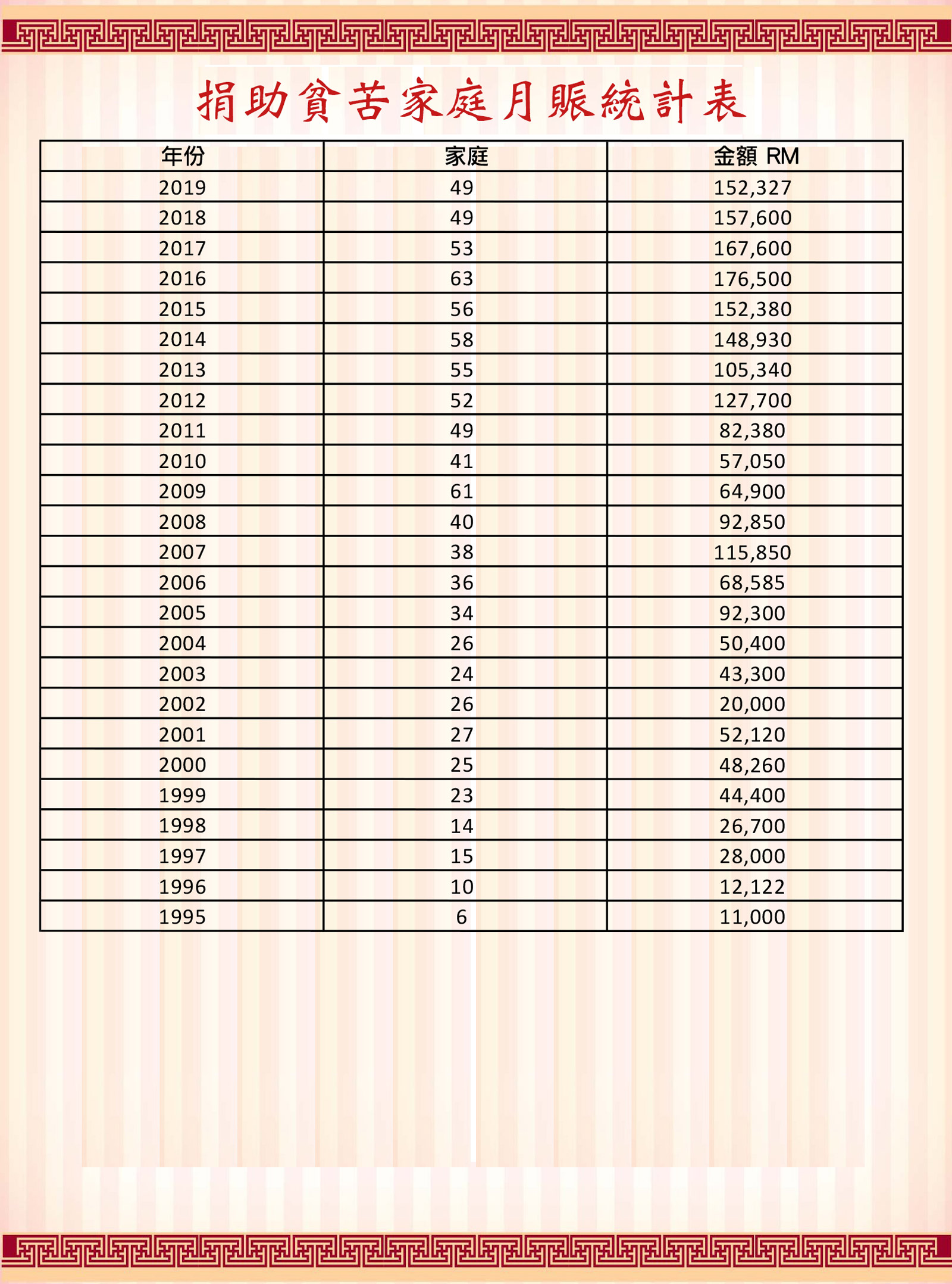 福利组也有按月账济贫苦弱势之家庭,每年受惠家庭约五十户。我们通常会在每年年初出访贫苦家庭,才根据实际情况决定每月资助款数。月账数额通常介于每月马币二佰元至五佰元。到新的一年,我们会再次造访受惠家庭斟酌跟进,才决定是否继续施济。另外我们也会到老人院,残障收留所,孤儿院等去访问及施赠礼品及捐助。 每逢社会上偶发意外之天灾祸害,福利组也会召集同德及善信,出钱出力,为灾黎略尽棉力。
