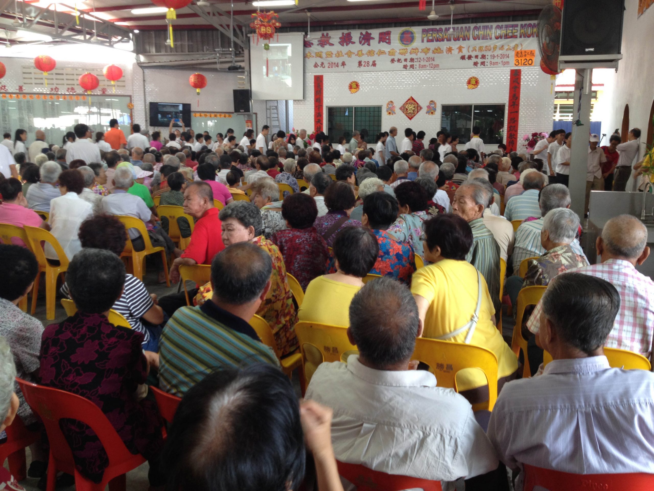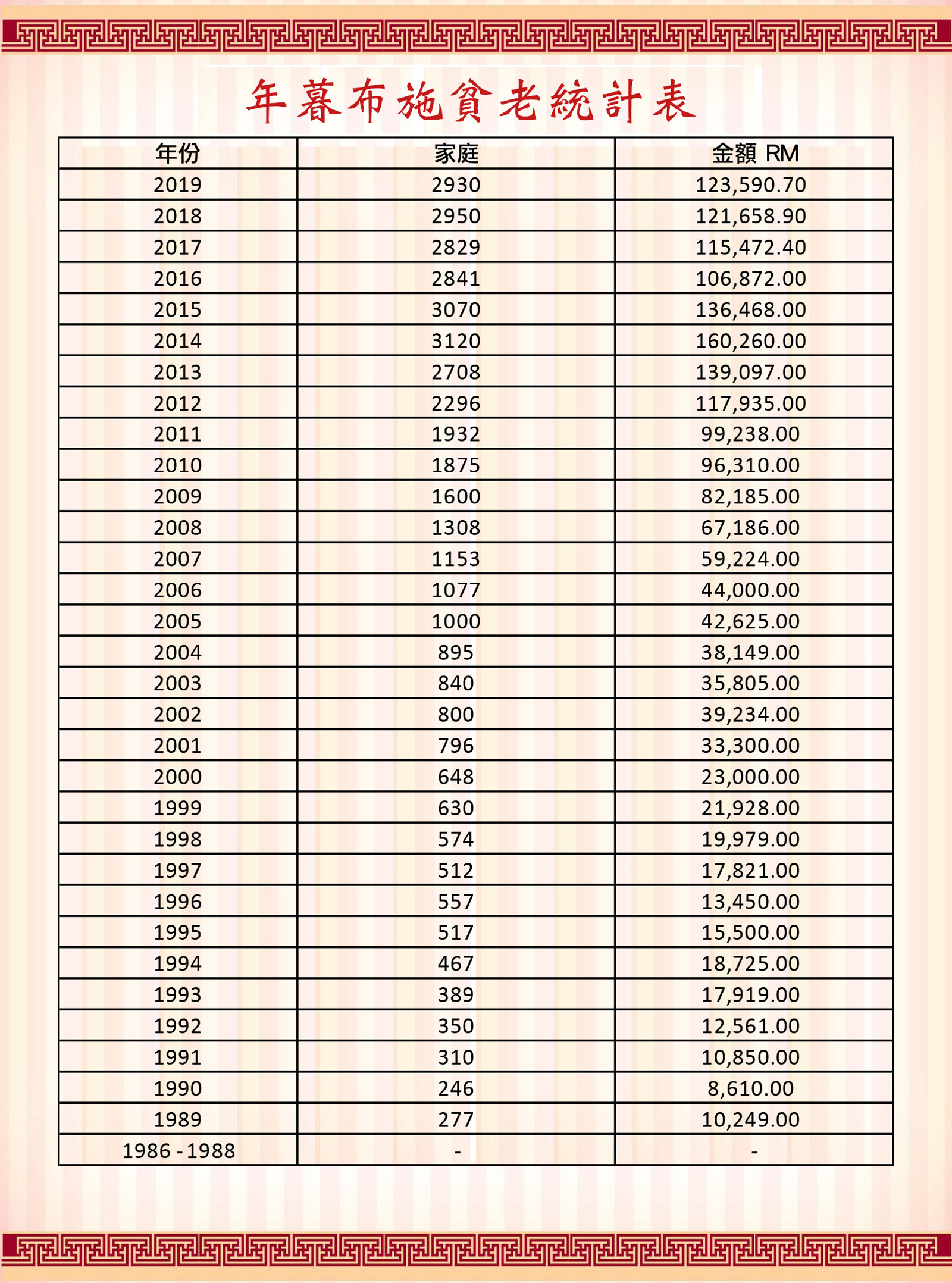 每年年暮的布施贫老活动从1986年举办至今己三十五届,2020年度之受惠人数为2930人。本阁是趁华人农历新年之际,联合社会善信举办布施,希望高龄之贫弱群体也能分享新春之喜悦,感人间温情。通常我们会在活动前之一个星期前先行登记以便准备工作。一般上每位登记贫老会获得本阁及善仕分发之新年红包数封,另加其他礼品。我们每年都获很多善长仁翁之热烈捐助,很多义工到帮忙工作,在此再次向大家致谢。